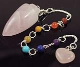 With a bob sculpted from a solid piece of rose quartz and a chain decorated with beads representing the 7 Chakras, this pendulum is a wonderful piece for your divination. Rose Quartz is a crystal particularly sensitive to emotional energies, particularly those involving love and as such, this pendulum is perhaps best suited for aiding in finding answers to emotional difficulties and questions concerning love. The conical bob measures approximately 1 3/4" in length and is affixed to a chain that